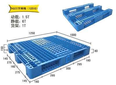 產(chǎn)品型號(hào): HD-12510CW1 產(chǎn)品貨號(hào): T43 產(chǎn)品外尺寸: 1250×1000×150 產(chǎn)品內(nèi)尺寸: 產(chǎn)品結(jié)構(gòu): 川字網(wǎng)格 產(chǎn)品內(nèi)容量(L): 承重量(T): 動(dòng)載:1.5T 靜載:6T 貨架:1T 產(chǎn)品認(rèn)可標(biāo)準(zhǔn): 該塑料托盤(pán)適合平地墊倉(cāng)、碼垛和上貨架使用;
