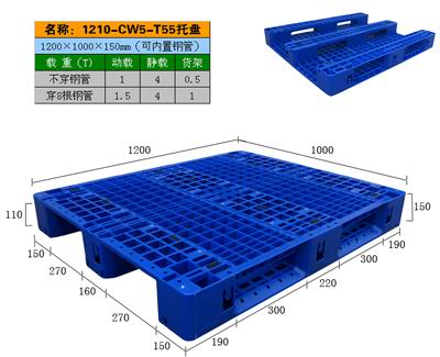 產(chǎn)品型號 HD-1210CW5 產(chǎn)品名稱 T55 產(chǎn)品外尺寸(mm) 1200*1000*150 產(chǎn)品結構 單面網(wǎng)格川字型(可內(nèi)置鋼管) 承載量 動載1.5噸,靜載4噸,貨架1噸 產(chǎn)品認可標準 ISO9001:2000質量體系認證 此款塑料托盤上表面可內(nèi)置4根鋼管,川字底部內(nèi)置4根鋼管,貨架上的載重量大,適合平地墊倉,在貨架上和