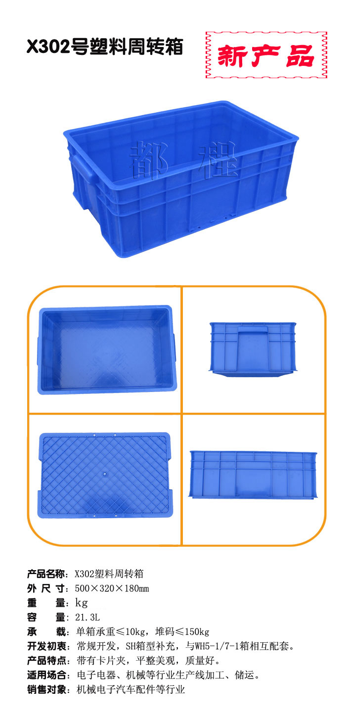 編號: X302 外尺寸(mm): 500*320*180 內尺寸(mm): 473*292*170 內容積(L): 21.3 備注: SH箱型補充開發(fā),與WH5-1/7-1箱相互配套,帶有卡片夾,平整美觀,適用于電子電器、機械等行業(yè)產線加工、儲運。